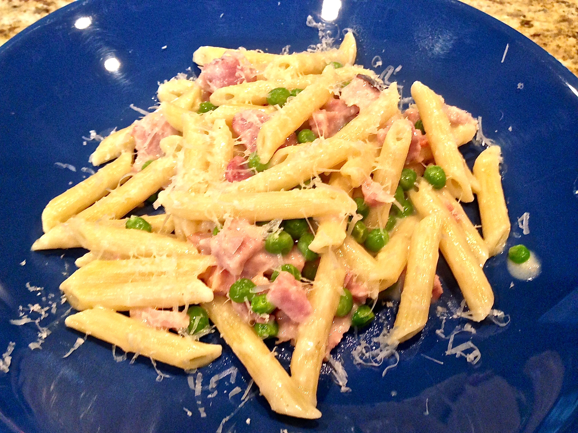 boil pasta. warm up sauce, ham and peas (and mushrooms!), then toss with pasta and serve with a bit of grated parmesan on top. ready in about 15 minutes—start to finish—which is much more on my timeline for a week night! i’ll have to try the real version at some point, but for a Wednesday night, this’ll do just fine.