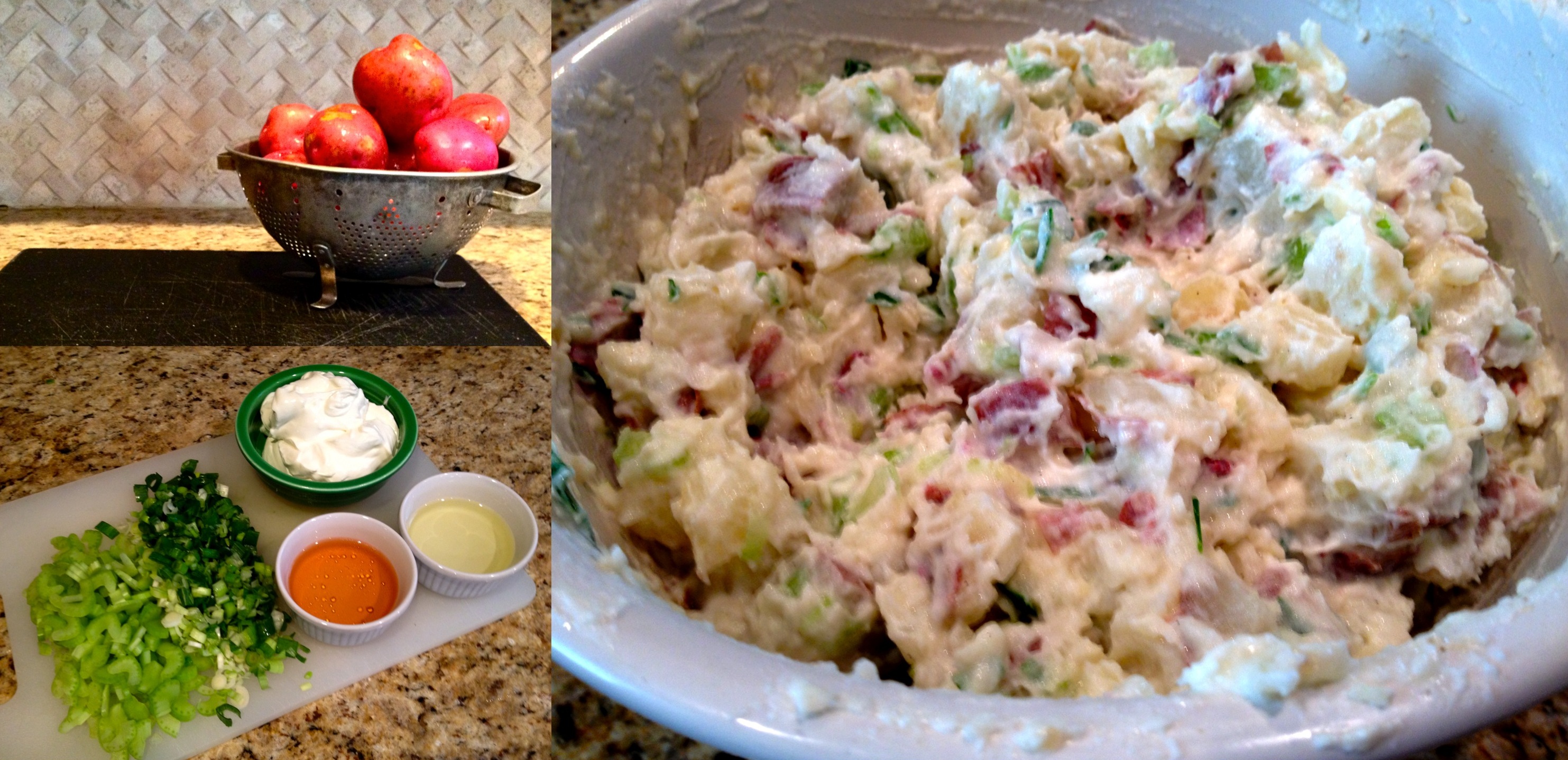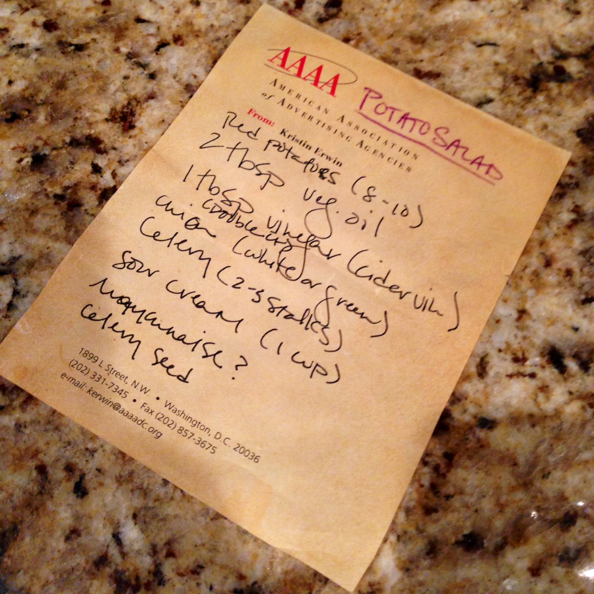 i know i’ve mentioned before how i can’t follow a recipe to save my life. not sure whether it’s short attention span, annoyance with details or what, but man, do i just hate to be tied to following instructions when i cook. that said, i found it kind of amusing today when i pulled out my “recipe” for potato salad. jotted on a scrap of paper from a work notepad some 15 years ago it’s now yellowed with time and a wash of vegetable oil that overturned during the process one summer. less recipe and more loose list of ingredients, it’s all the reminder i need to successfully whip up this summer side that’s the only potato salad i knew at my house growing up. i know i could never just give this to anyone and have it come out okay. there are extras like salt and pepper, knowing by look, feel or taste when i need to add a little more this or that . . . knowing that the ingredients with question marks are items that may or may not be added and that my mom couldn’t quite remember, herself, when she rattled off the recipe whether they should be included or not. but every time, it comes together effortlessly, with kudos no matter where i take it. as i mentally prepare for tomorrow’s Father’s Day dinner, complete with 3 new actual recipes i’m going to try, i just hope that if they’re good, they’ll one day become as natural to me as this one is.