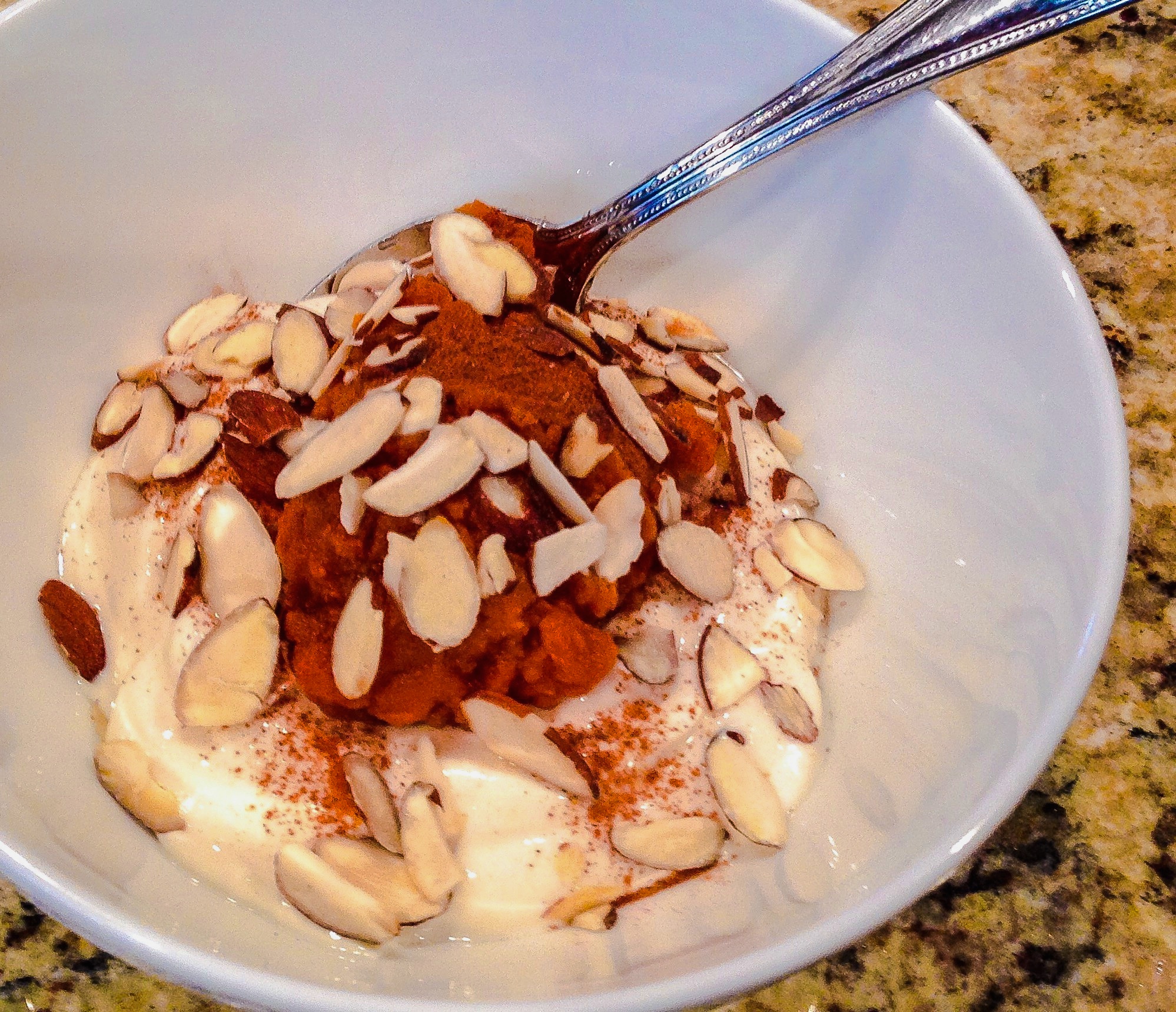 i don’t like really sweet things for breakfast and with no extra sweetener, this is just savory enough to not feel like dessert. it’s easiest thing on the planet, pretty healthy and easy to make and carry to work — because that’s about the only way i’m ever gonna get a morning meal down. this will definitely be breakfast at least until the can of pumpkin is gone. i call it an idea, more than a real recipe. enjoy!