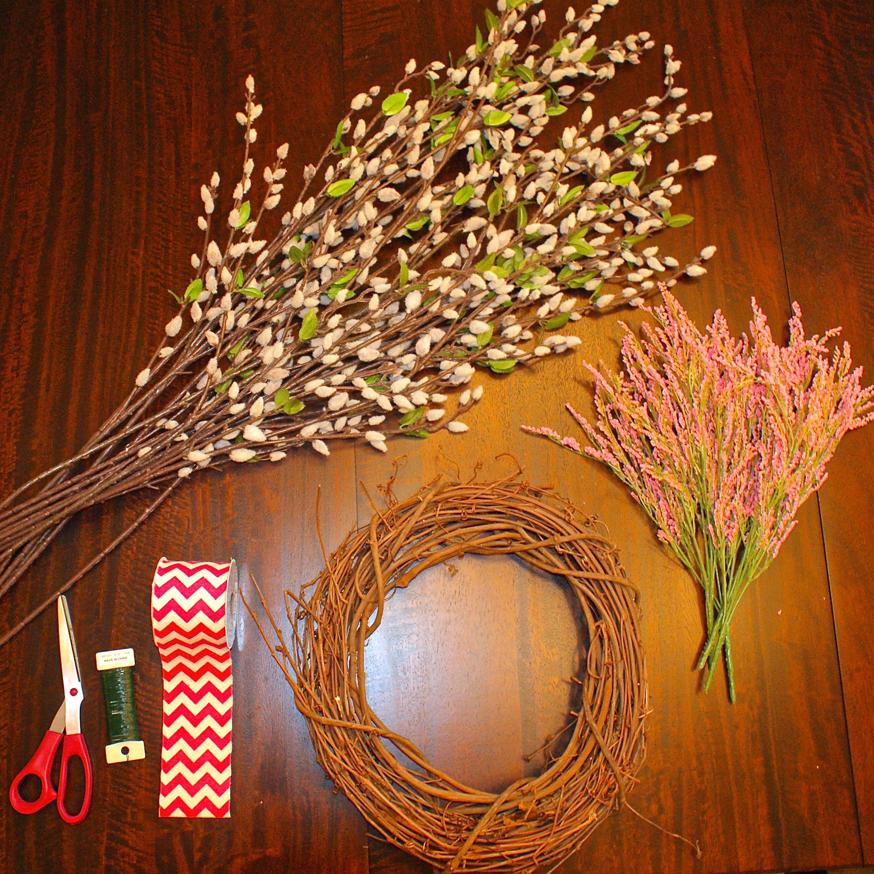 14 pussy willow stems. 4 stems of pink buds. 12″ twig wreath form. 6′ roll of cotton chevron ribbon. floral wire. scissors.