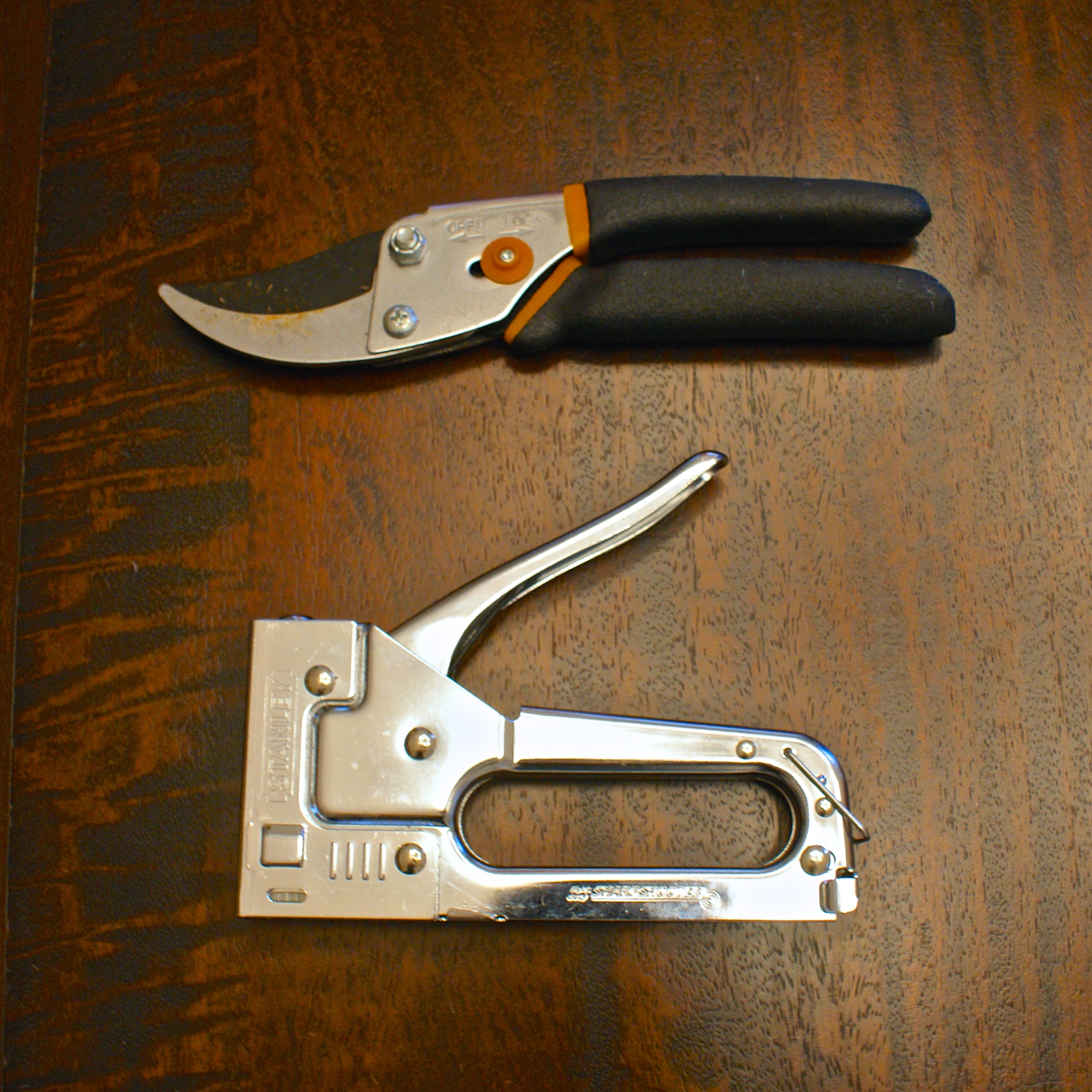yeah, so the garden clippers were necessary to clip off the ends of the pussy willows (and it was still hard as hell!). the staple gun was how i attached the whole shebang to the door. read on . . .