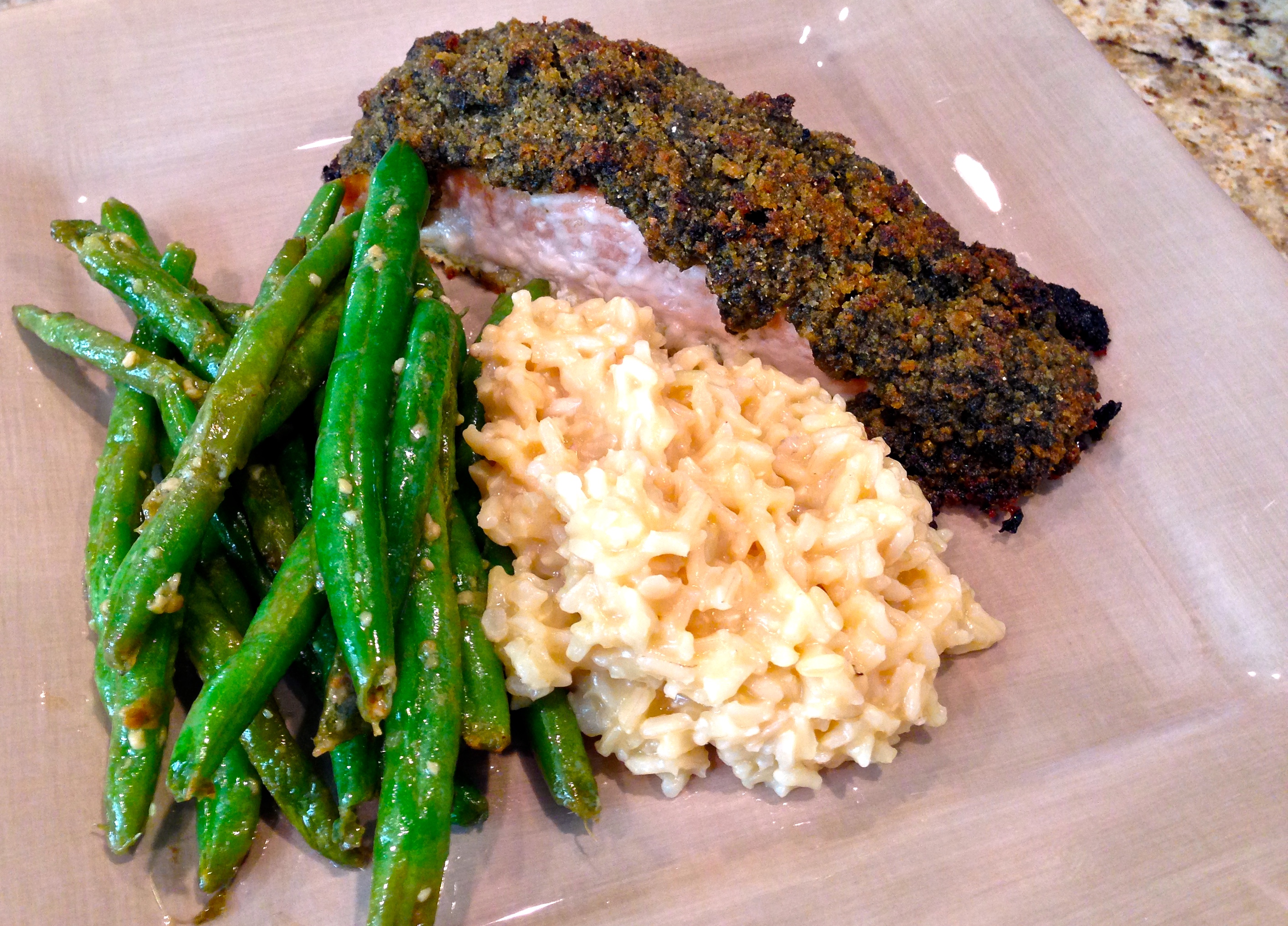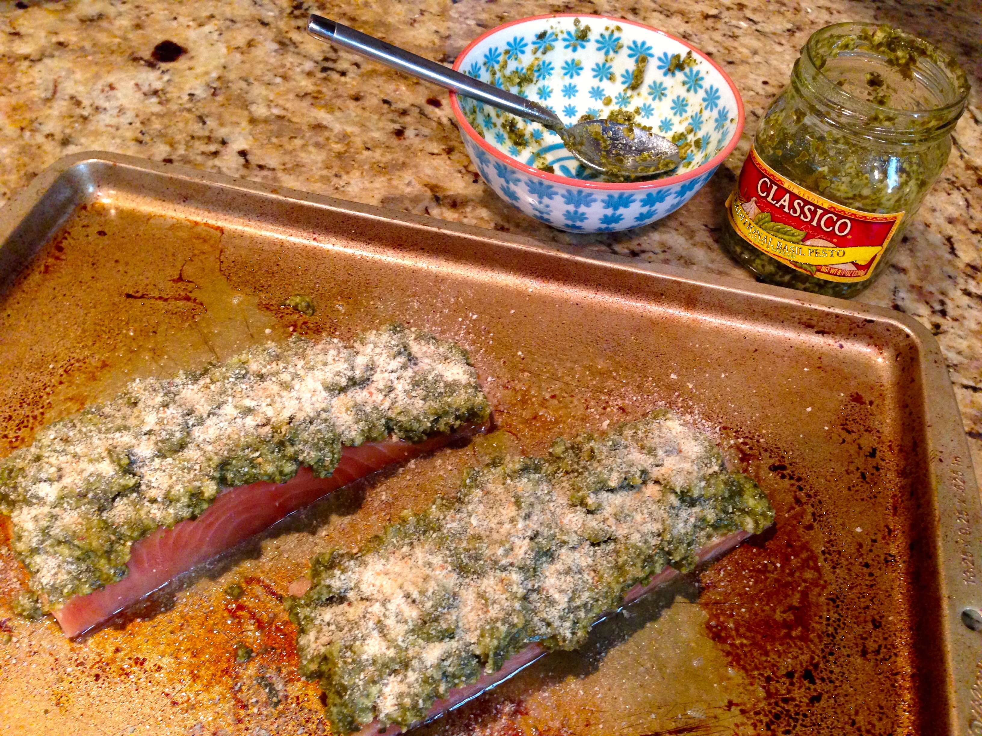 y’all know how i do, so when i say “cook” you know it’s a very loose term around here. i had a pile of chicken in the freezer, but was itching for seafood and got a good deal on some salmon today. i kind of do the same thing with fish pretty much every single time (Emeril’s Fish Rub + grill pan), so i started perusing the pantry for other options. i’m also kind of in a use all your old shit kind of mood since a lot of stuff got cleared out the week before and of France. anyway, because i buy random stuff all the time with good intentions (and then never follow through), there was a jar of pesto. i thought that might be interesting. turns out, pesto encrusted salmon is actually a thing and i’m not crazy to think it might work.