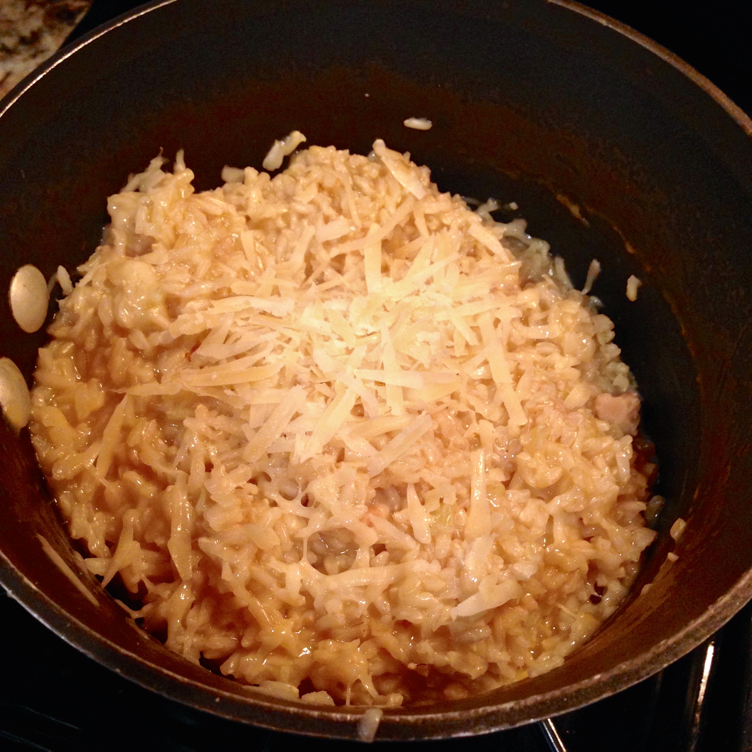 also, fake risotto. ha. i was in the midst of cooking up some brown rice (half water, half chicken broth), when i decided it needed to be more (Spy is not a fan of plain old rice). so just before it was all done, i added half a can of cream of chicken soup (i was out of mushroom, which was the first choice) and about an ounce of shredded Parmesan. it turned out super creamy and delicious. i would just maybe cook the rice in the broth about 10 minutes longer next time to make it softer.