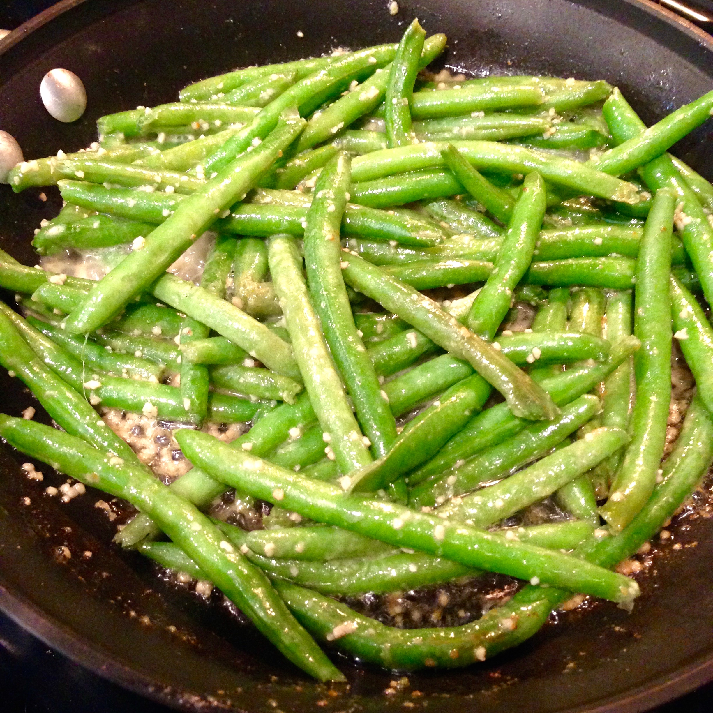 green beans steamed, then quickly sauteed in butter and garlic (it is apparently National Garlic Day, after all), then splashed with lemon juice.