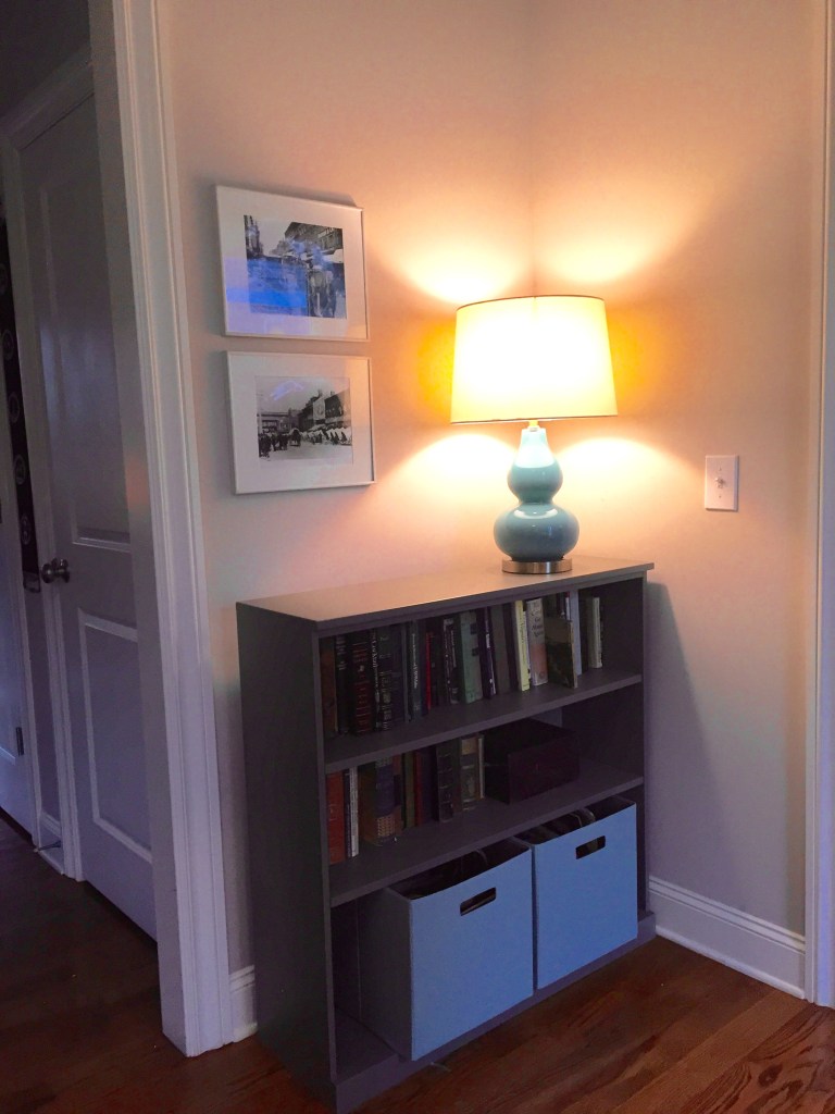 office after — bookcase & lamp more tidy storage and a lamp i love bookshelf — Ballard Design Original Home Office lamp — Target canvas storage — Target