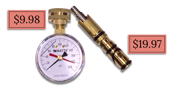 FullSizeRenderadjusting the water pressure was easy peasy. first, you just screw your $10 gauge to your outdoor faucet to check the pressure. it read 100 psi when i checked — no idea if it’s always been set that way, if plumber 1 set it that way or if the pressure has creeped up over the years because the regulator is, in fact, failing. only time will tell on that. but then you just twist a screw on the end of the valve to increase or decrease as needed. it took a few times back and forth up my ladder and outside to the spigot, but literally, i was in no danger of even chipping a nail with this one.