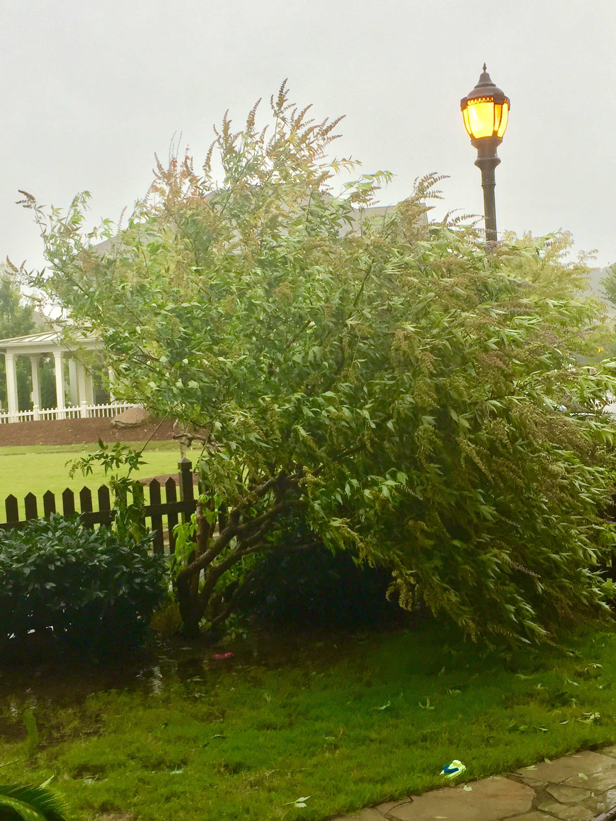 I’ve never experienced anything like this. I didn’t even think the wind was really blowing hard enough consistently to do this to the tree in our back yard. Well, 4 days after the storm, the tree is in pretty much the same position. It’s not coming up at the roots. Its already crooked branches are all literally just bent sideways at some point that is too subtle to discern. Spy obsesses over this tree (that I honestly believe was just supposed to be a bush when it was planted 9 years ago), trimming branch by branch until it is just so. I’m not sure what it’s ultimate fate will be. The peach tree showed one sign of imperfection for about 2 seconds and became firewood within days. But I like to think of this one as a metaphor for how life experiences can forever change you. Sometimes you bounce back. Sometimes you just begin to grow in another, new direction.